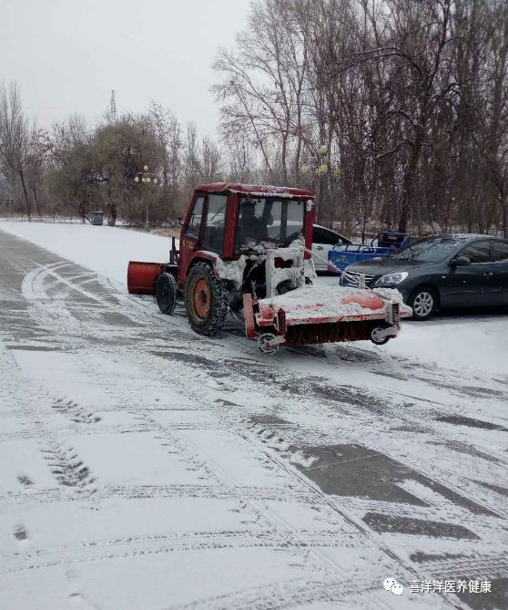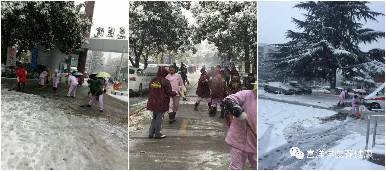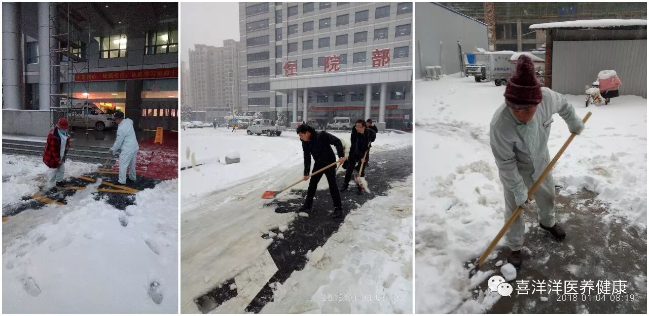 伴随着凛冽的寒风, 喜洋洋后勤队伍始终奋战在扫雪第一线, 使得各条通往院区的主干道积雪及时清扫干净, 确保了院区道路的畅通无阻, 为医务人员及就诊患者开辟了一条条洋溢着温情的通畅方便之路。